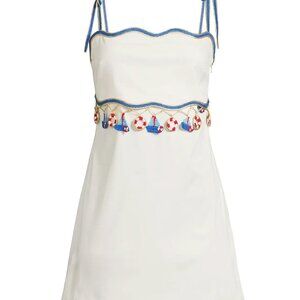 This Muse minidress from My Beachy Side is crafted of stretch cotton and features playful crochet yacht and lifebuoy motifs. The self-tie straps and scalloped neck add a touch of charm.