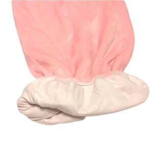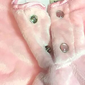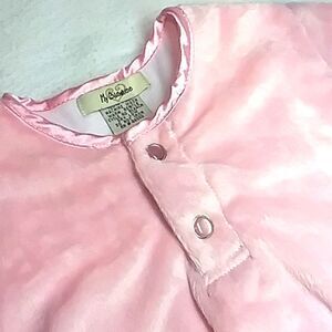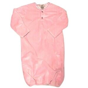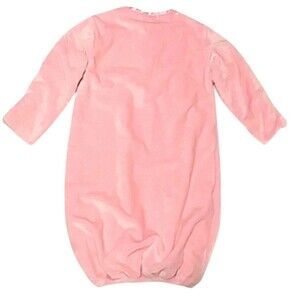 The Sleeper Gown Minky is a bunting gown that comes with folding cuffs at the end of each sleeve for warm fingers and no facial scratching. It has a really stretchy ring of elastic at the hem that keeps baby cozy and warm but allows for easy dressing and diaper changes. This pretty pink one is in like new condition with no flaws. I don't think it's been worn. I think it was just run through the wash in preparation for the baby's arrival and then not worn. In some photos there seems to be a mild yellowish haze or fading. That is a camera error probably caused by the sheen of the velour and is not there in real life.