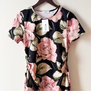 Brand new. Black/pink floral print. Round neck. Short sleeves. Midi length. Ruched mid bump panel. Ruffle hem. Stretch pullover dress. Fitted bodycon.