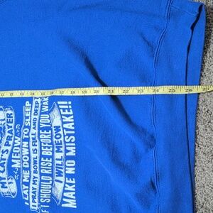 My Cats Prayer Gildan Blue Crewneck Sweatshirt Size Large Vintage Inspired Funny joke cat mom cat lady. My camera picks up blue brighter than it is irl, is a bit more faded but goes with the theme. Reads: my cats prayer. Meow I lay me down to sleep. I pray my bowl is full and deep. If I shall rise before you wake I will meow make no mistake lol love it