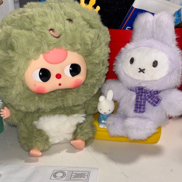 Adorable plush toy set featuring a green character with a crown and a purple character with a scarf. Perfect for collectors and kids.
