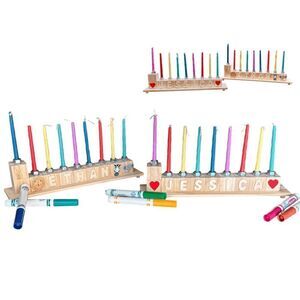 Celebrate The Festival of Lights in a unique way with the My DIY Hanukkah Menorah Kit, allowing kids to unleash their creativity while crafting a personalized wooden play menorah. This Personalized Menorah is created from wooden alphabet blocks and metal nuts to hold the candles. As you create your modern Jewish tradition, this one-of-a-kind Menorah will be a hit for the kids to light for the 8 nights of Hanukkah!