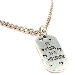 New! Some Heroes don't wear capes, they wear camoflauge. Daddy will wear this stylish necklace proudly. Features: Stainless steel rope chain necklace. Measures 20 inches. Single military dog tag style charm with ‘My Daddy Is A Soldier’ sentiment. Each charm is 100% hand made with genuine American Pewter. Handmade in the USA. Comes with gift box.