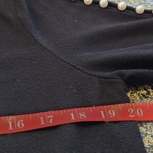 This elegant black top features stylish pearl accents along the sleeves, adding a touch of sophistication to your wardrobe. Perfect for both casual and formal occasions.
