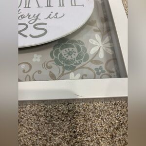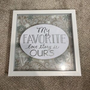 “My Favorite Love Story Is Ours” 12x12 Shadow Box Framed Art Work Wedding. Hook to hang is on back. Measurements in photos. One small scratch on front but not noticeable from afar.