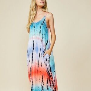 Coral, Jade & Purple Tie Dye Sleeveless Spaghetti Strap Maxi Dress