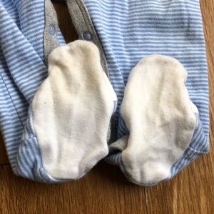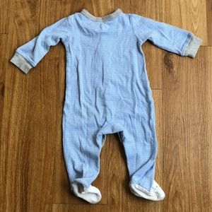 Baby blue and white striped footies. Snap up, bunny feet, and “My first Easter” patch. Bottom of footies have slight staining shown in last picture. Bundle and Save :)