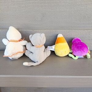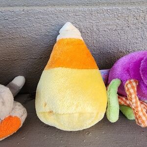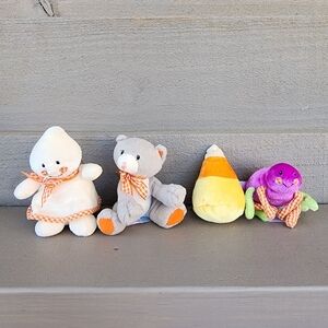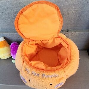 Cute orange pumpkin plush toy with green handle. Features embroidered face and checkered details. Reads "my first pumpkin". Zip open the top to reveal 4 Halloween/fall theme toys. Ghost, candy corn, cat and spider. Spider makes a rattle sound. So cute for baby to play with or to decorate a room! Candy corn has a little spot on it, but other than that it is in great used condition.
