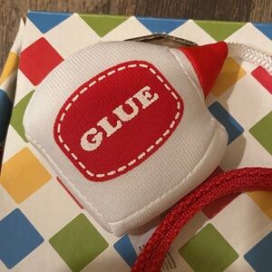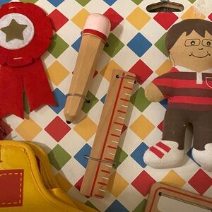The set includes a soft school bus bag, a glue bottle toy, a wooden pencil and ruler, a felt ribbon, and a soft character doll.