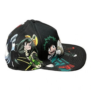 My Hero Academia Class 1-A Snapback Cap, your favorite heroic students are around the cap- Deku, Bakugo, Uraraka, Todoroki, Iida, and Froopy, underneath the bill is All Might with "Smash" text design, excellent condition.