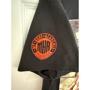 Show your love for My Hero Academia with this officially licensed Kirishima anime graphic tee. This black short-sleeve shirt features bold anime panels of Eijiro Kirishima with striking red Japanese characters and an MHA "Plus Ultra" sleeve emblem. Made from 100% cotton for comfort, it's perfect for fans, collectors, or casual anime style. Gently used with no visible flaws — a great wearable collectible.