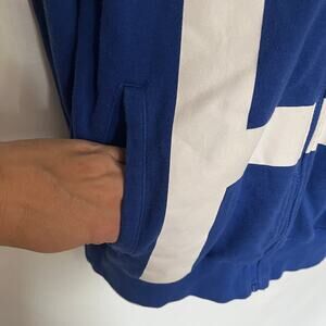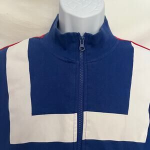 Pre-owned condition, mild pilling all over, also white marking on sleeve cuff, tiny tear in white stripe on front, please see photos