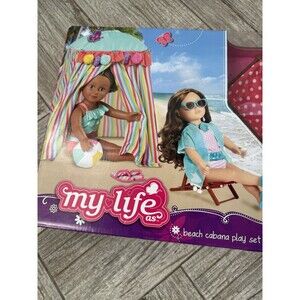 The "My Life As Beach Cabana Play Set" is a 3-piece doll playset designed for 18" dolls like American Girl. This set includes a strand of lanterns, a cabana, and a beach chair, perfect for beach-themed outdoor adventures. Made of cloth and plastic materials, this original My Life As product is ideal for young girls who love to create imaginative play scenarios with their dolls. Packaged in the original unopened box, this set is a great addition to any doll collection for creating fun and exciting beach-themed stories.