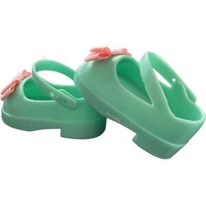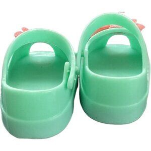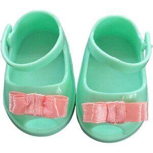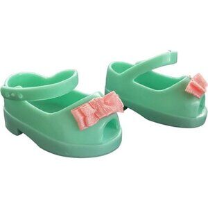 These sandals belong to a doll's life of luxury. Imagine a world where tiny green sandals with pink bows reign supreme, captivating doll audiences far and wide. They're not just any sandals; they're the footwear of choice for dolls with a flair for fashion, strutting their stuff down the doll runway.