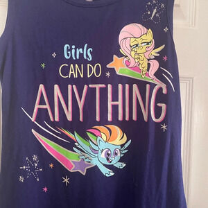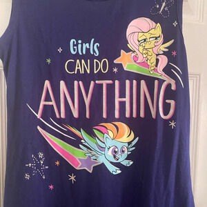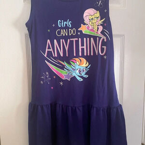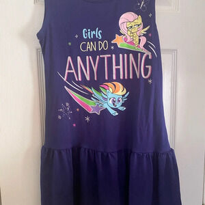 Super soft knit dress Blue sleeveless dress with twirl skirt Front says girls can do anything! Size 7-8 Smoke free home