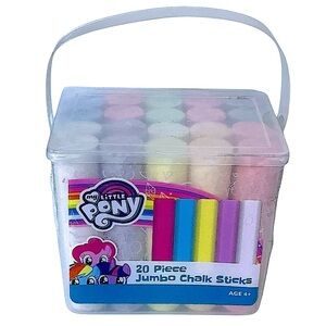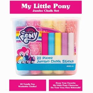 My Little Pony 20 Pieces of Jumbo 4" Sidewalk Chalk in 10 Bright colors with a Colorful My Little Pony storage tub with handle that allows for on the go Pony fun