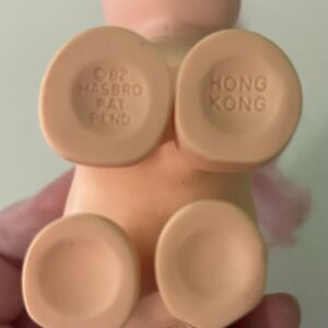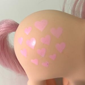 Notes: Hair is in excellent condition. Symbol rub on the hearts. Slight Head/Body mismatch. She has been opened up and cleaned internally. The washer was removed because it was broken and rusted. It has been replaced with zip ties and the tail is secure.