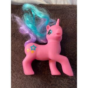 My Little Pony set of 3. Friendship manic , rainbow dash, brand new in package. 2 others preowned condition. Pink 5 1/2 inches , had no marks . Purple 4 1/2 inches , has 2 small black dots , and one tiny orange dot. Possibly marker . See pictures.