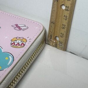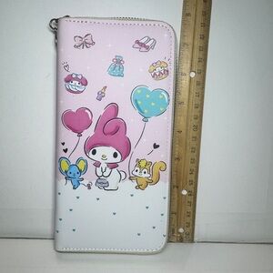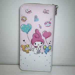 Charming wallet featuring My Melody with heart balloons. Delightful pink and white design. Brand New wallet. Measures approximately 7 1/2 inches by 4 inches in width. Has two compartments, with slots for 12 card slots, a zippered coin, and an area for bills.