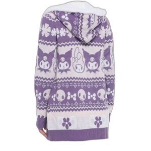 Your favorite pair of besties are here to make sure you stay cozy and warm. This open cardigan is partially lined with faux sherpa (the hood is fully lined) and is knit with adorable images of My Melody's and Kuromi's faces, plus skulls, bows and flowers.