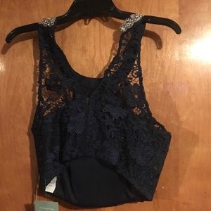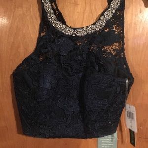 Navy jeweled halter top with long a line skirt. Shows a little mid section