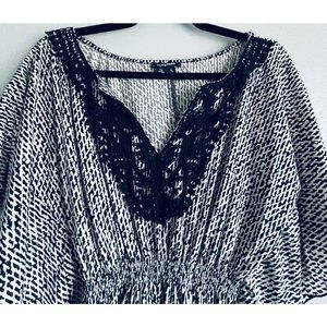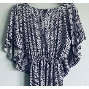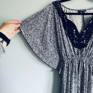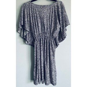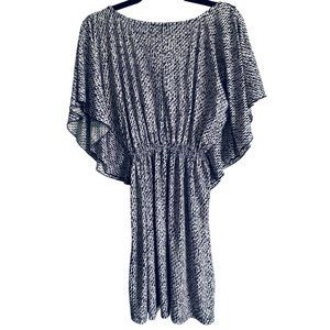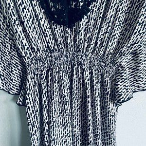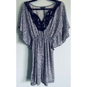 Stylish mini dress by My Michelle. Features a black and white pattern. Elegant V-neck design with flowing sleeves.