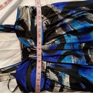 BRIGHT BLUE, GRAYS, BLACK GEOMETRIC PATTERN MINI DRESS