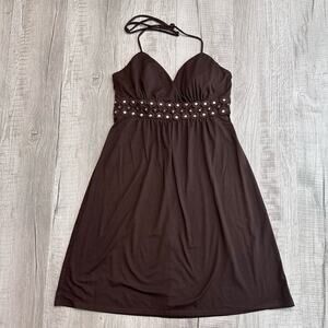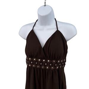 My Michelle Brown Boho Halter Dress WMNS L Knitted Empire Waist Open Back Mini