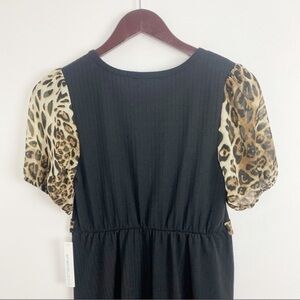 Brand new. Black ribbed knee length dress. Stretch. Pullover. Faux leopard print belt detail. Leopard print puff Short sleeves. Comfy. Stretch dress. Lightweight. Cinched at the waist.