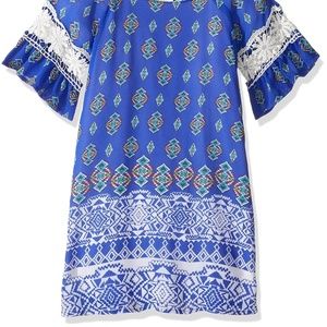 MY MICHELLE girls royal blue tribal geometric print shift dress with crochet trim bell sleeve and cut-out cold shoulder detail.