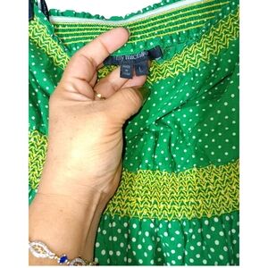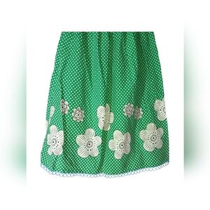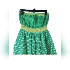 Vibrant green dress with white polka dots. Features yellow stitching detail. Ideal for casual wear.