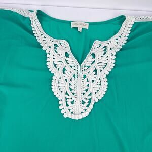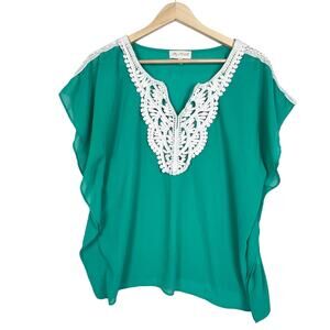 My Michelle L Sheer Green Top Blouse White Crochet Trim Short Sleeve Polyester