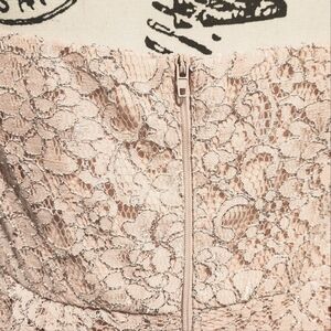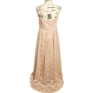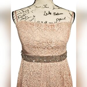 It is so full and stunning! A soft blush pink Hi-Lo dress with a shimmery silver thread rose like pattern outlined throughout.