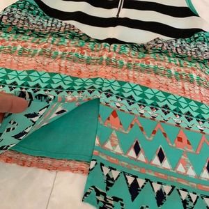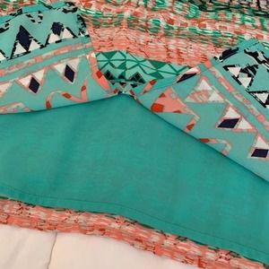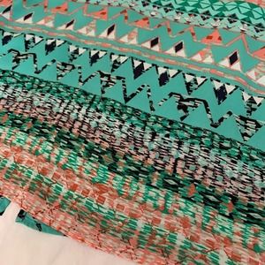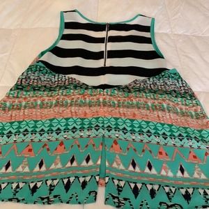 EUC size Large, 100% polyester. Zippered back, has slit on back bottom, lined on the front side of the blouse. Approx 25” long from shoulder to bottom hem, 19” pit to pit.
