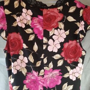 Elegant floral dress featuring vibrant pink and red flowers on a classic black background. Perfect for any occasion.