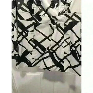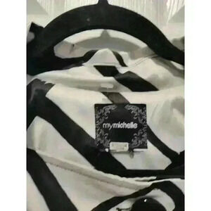 Add a pop of color to your wardrobe with this black and white geometric patterned My Michelle pea coat jacket. Featuring a ruffled design and square button closure, this mid-length coat is perfect for any season, whether it's winter, fall, or spring. The jacket is made with a polyester/spandex outer shell and lined with polyester, making it comfortable and easy to care for with machine washable instructions. The coat is available in size L, with a classic fit and long sleeves. This Y2K style coat is perfect for any occasion and will make you stand out in any crowd.