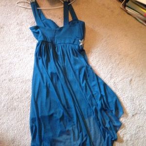 This is an aqua blue high low dress with beautiful jewelled bust and jewelled straps