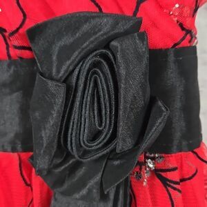 Beautiful girly bubble dress with shimmery mesh overlay, flocked floral design & sparkly silver glitter sequins. An elegant black satin rosette and sash are on the front with tie in back.