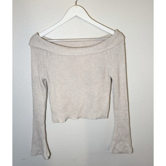 My Mum Made It Beige Off Shoulder Bell Sleeve Cropped Sweater Size Small Medium