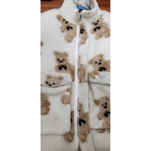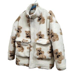 Cozy and trendy teddy bear sherpa jacket by My Mum Made It. Features plush fleece fabric, oversized silhouette, and adorable teddy bear print. Warm, soft, and perfect for winter streetwear or cute aesthetic looks. Two large front pockets and full zip closure.