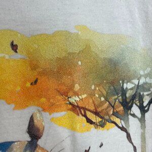 Unisex adult t-shirt with My Neighbor Totoro watercolor graphic on front. Short sleeves, crew neck, heathered cream-color. 100% Cotton.