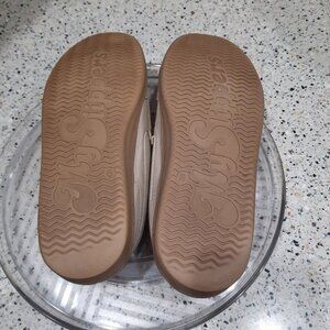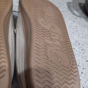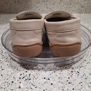 The product is a pair of women's slipper shoes by My Pillow, designed for comfort. These moccasin-style slippers feature a slip-on closure for easy wear. They are made of cream-colored leather with a US shoe size of 8. Perfect for cozy indoor outdoor lounging, these slippers offer a combination of style and comfort.