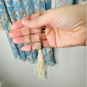 The combination of the cream and light blue accordion pleats, along with the crochet fringe and braided neckline, creates a beautifully boho-chic vibe. The metallic gold thread adds just the right amount of sparkle for a touch of elegance.