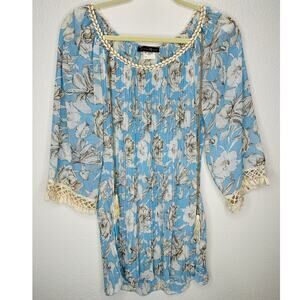 My Story Paris Cream & Light Blue Accordian Pleated 3/4 Sleeve Crochet Fringe Braided Neckline with metallic gold thread Blouse