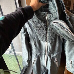 Guaranteed to turn heads - this 'IT' suit is form fitting and flattering with ultra-luxe teddy sherpa detailing. Inspired by exploration and adventure, the athletic sherpa ski suit in shimmering anthracite blue / grey is the perfect mix of performance meets fashion.