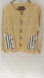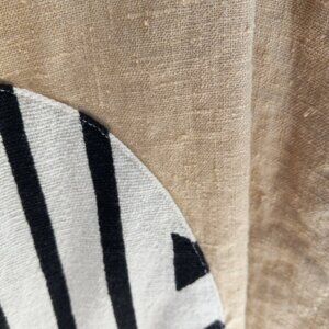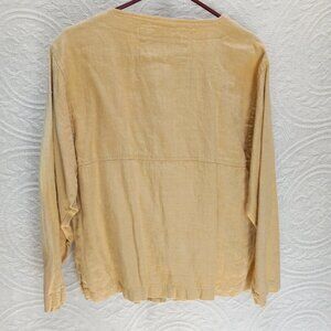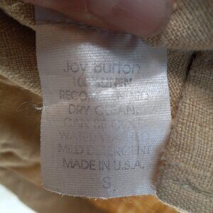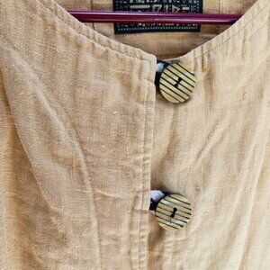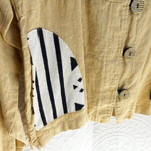 My Tribe 100% Linen Tribal Ethnic Look Jacket with very unique buttons that look and feel like carved lines. The buttons are very large. It has pockets that are made of a mismatched fabric in black and white print. The color of the jacket is like a yellowish brown. The tag says it was made by Joy Burton for My Tribe. It is very unique and attractive. It is a heavier linen which is perfect for cooler weather. Excellent condition.