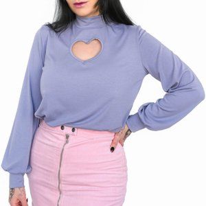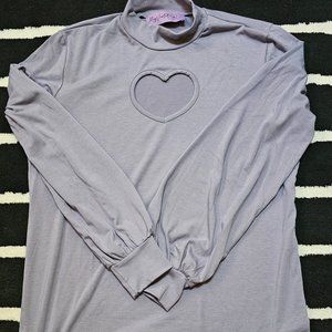 New without tags, size small. Long sleeved mock neck top with a perfectly heart shaped cut out at the chest. Slightly puffed sleeves, stretchy & oversized fit. Looks a little more gray in the photos, but its more of a smoky lavender color.