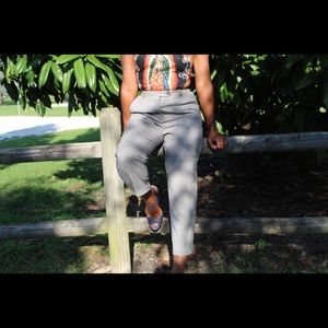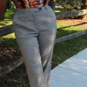 Checkered print, natural waist fit, pants. Cute and to the point looks perfect with tucked in tees heels or flats. They are a petite fit. Cropped and will probably be a pair of go to pants for comfort and style.