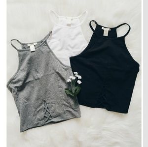 Tank tops like the ones pictures above with lace detail the lace up detail at the bottom but the bottom lace up detail is definitely preferred.