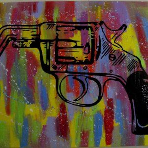 When I asked about the gun piece, it wasn't really his niche, he brushed me off and said it wasn't for sale and put it in the back of his art studios closet. Almost a year went by and ghost was selling out shows and running out of paintings. I asked again about the gun painting. After hounding ghost for about 5 hours this is what he told me.